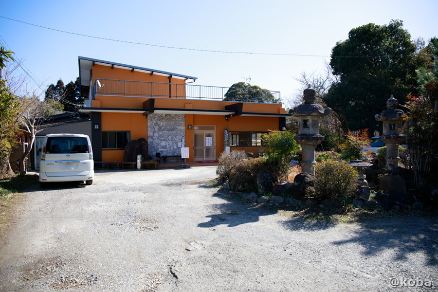 広い駐車場から見た「つるんつるん温泉」の外観全景。入り口付近の大きな灯籠が目印。