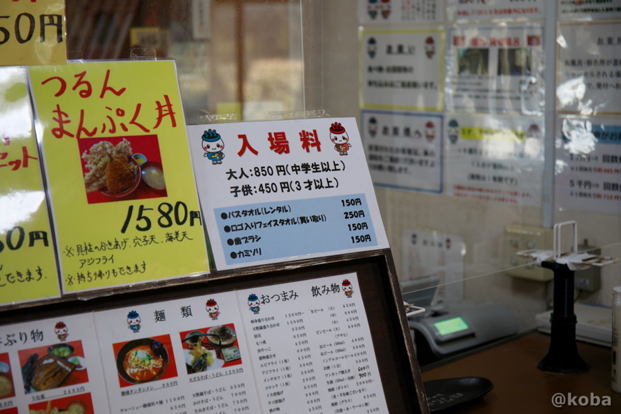 大人850円・小人450円の入場料と、タオルレンタルなどのアメニティ料金が書かれた案内板。