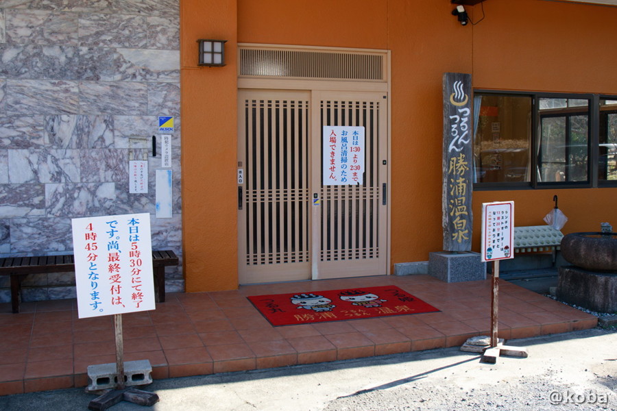 施設を訪れる際の目印となる、木製の看板と営業時間が掲示された「つるんつるん温泉」の入り口付近。