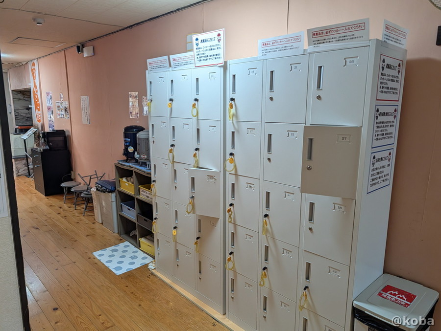 入浴前後に嬉しい水分補給スペースと、鍵付きの貴重品ロッカーが並ぶエリア。