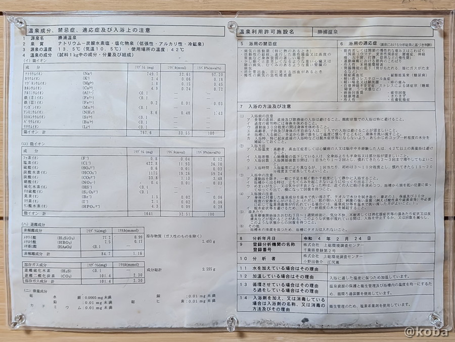 源泉名は「勝浦温泉」。泉質や適応症などが記載されている温泉成分表。